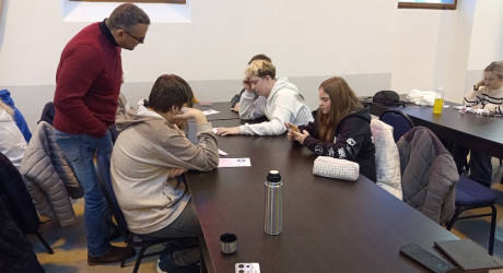 Po skupinové části čekala týmy krátká pauza, focení skupinové fotky venku společně s koordinátorem soutěže, Janem Votočkem. “Když je venku tak krásně, pojďme v tričku na fotku tam, mě zima nebude a vás to probudí,” dodal před promítáním partnerského videa od Asmodee.